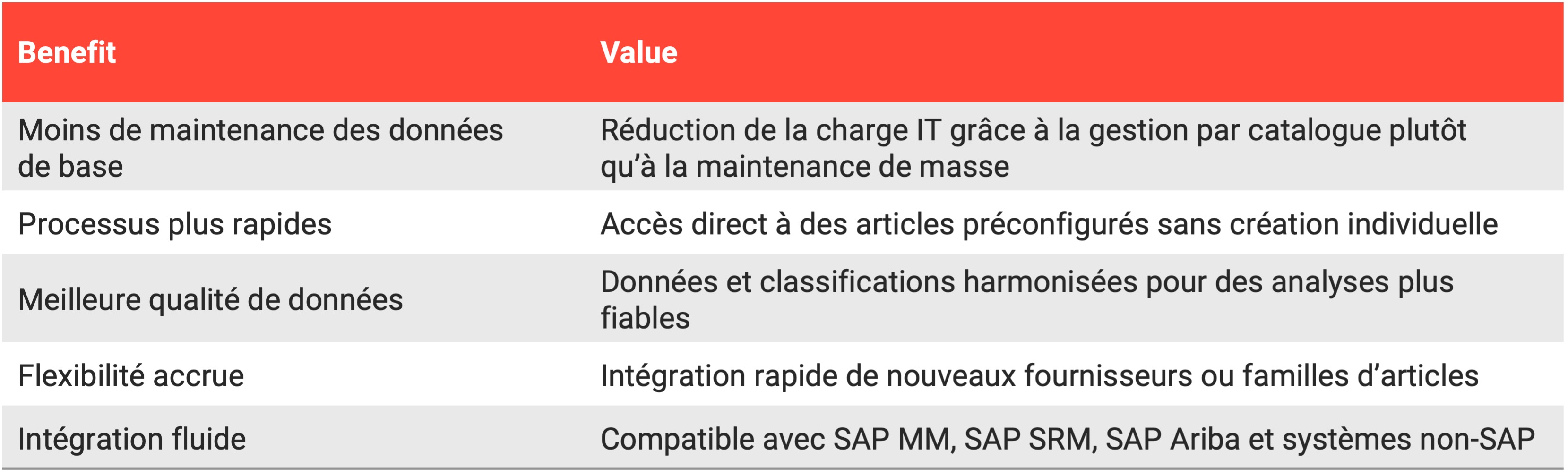 Plutôt que de créer une fiche article pour chaque produit, SAP Lean Catalog permet une gestion centralisée des articles de catalogue, directement utilisables dans SAP S/4HANA, SAP Ariba, SAP Lean Request et dans d’autres processus d’achat.