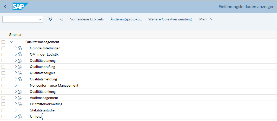 Ein wesentlicher Unterschied zwischen On-Premises und SAP Cloud ERP liegt in der Benutzeroberfläche. Beim klassischen SAP GUI erfolgte der Einstieg ins Customizing über die Transaktion SAP Project Reference Object (SPRO) über den sogenannten Einführungsleitfaden, um einen Überblick über alle Customizing- und Anpassungsmöglichkeiten im Bereich Qualitätsmanagement zu erhalten (siehe Abbildung 1).